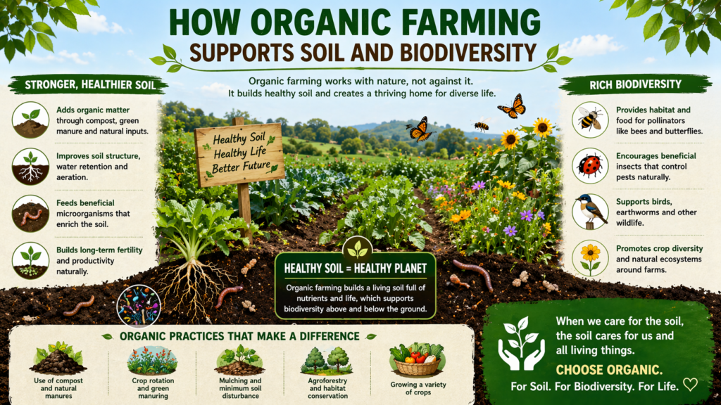 Organic farming supports soil and biodiversity because it treats the farm as a living system. It builds fertility naturally, protects beneficial organisms, reduces chemical disruption, and encourages a healthier balance between crops and the environment.